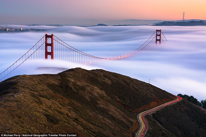 10. The Golden Gate Bridge covered in mist