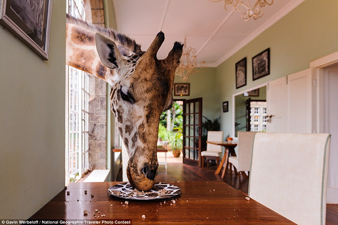 3. An indiscreet giraffe munches on a light snack at the hotel kitchen of Giraffe Manor in Nairobi