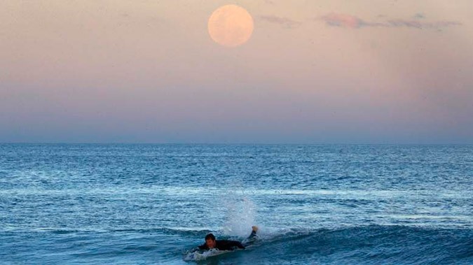 A Sydney surfer rides the waves in the light of the full moon.
