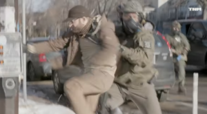 Following the kick, the agents return and try to arrest Pretty, throwing him to the ground, while using chemical agents to disperse other protesters.