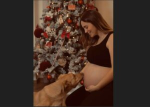 An ornament on the Christmas tree reads: "The first Christmas in mommy's belly and daddy's heart"