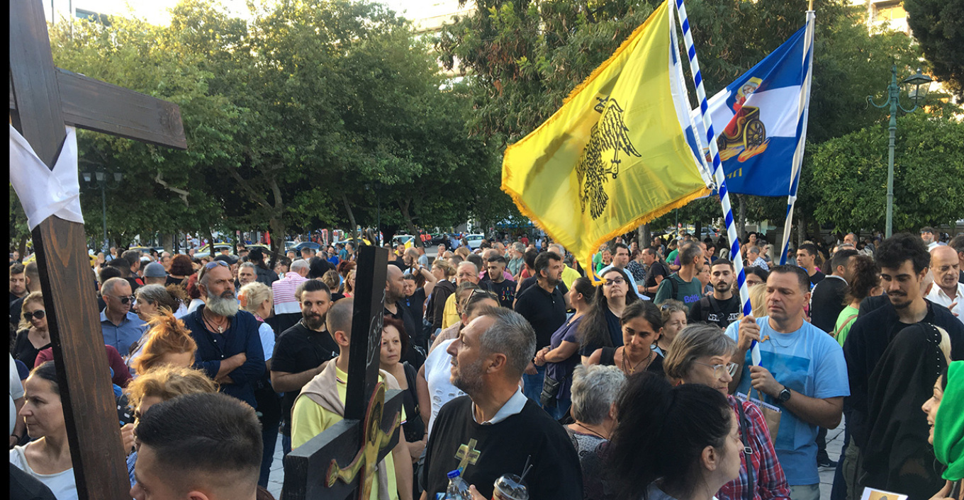 The rally in Syntagma Square is attended by monks and people holding crosses, icons of the Virgin Mary