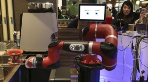 Robot barista brews coffee and serves customers