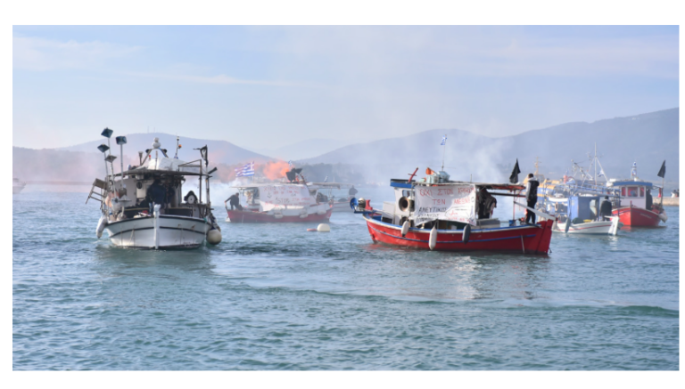 Strong police presence at the port keeps the gates closed – Fishermen and others attempt a blockade from the sea – Live footage from the scene