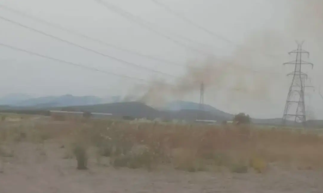 The fire isn't affecting the storage area; it's burning with low intensity amidst sparse vegetation