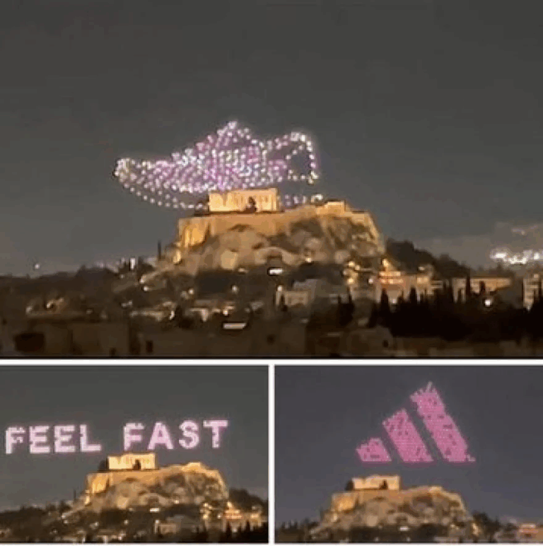 A giant shoe image looming over the Acropolis during a drone show on Thursday, part of a promotional campaign for a sports brand, sparked strong reactions